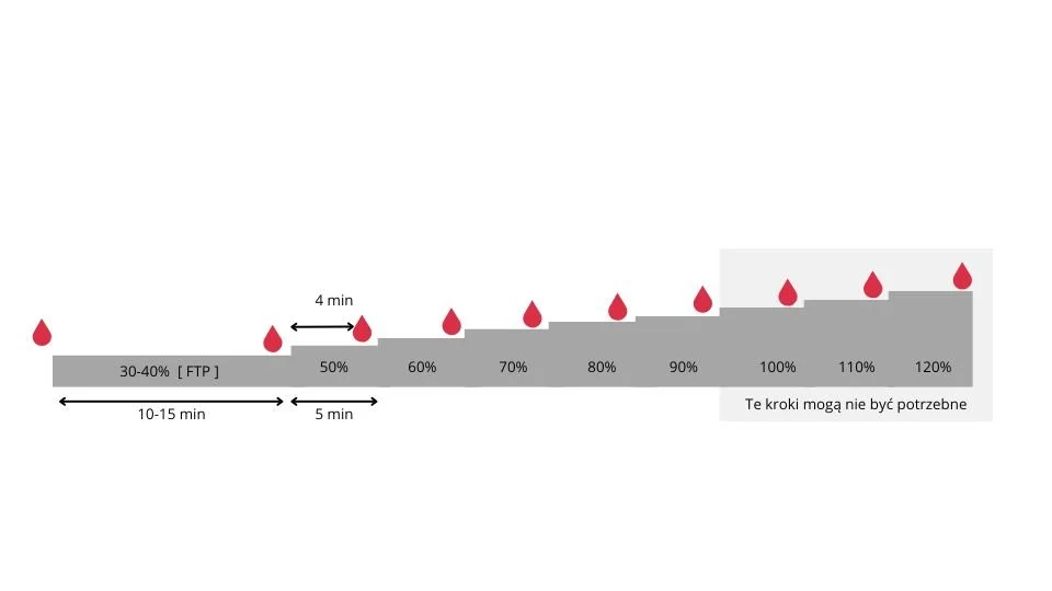 Test laktatowy polega na stopniowym zwiększaniu intensywności wysiłku (np. co 5-6 minuty) i pobieraniu próbek krwi z palca lub ucha. Każdy etap pozwala zmierzyć stężenie mleczanu. Na podstawie wyników tworzy się krzywą mleczanową, a trener identyfikuje punkty LT1 i LT2.